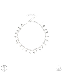 Dainty silver beads dangle from a shimmery silver chain encircling the ankle, creating a flirtatious fringe. Features an adjustable clasp closure.